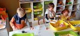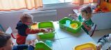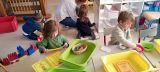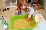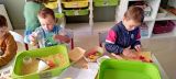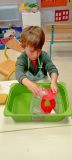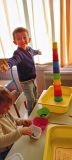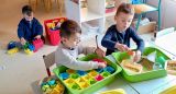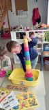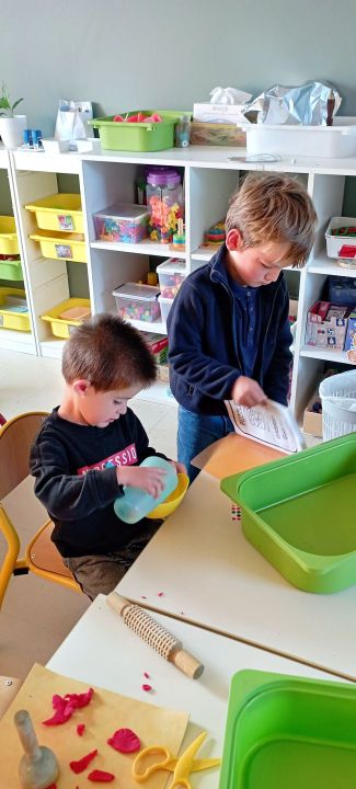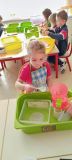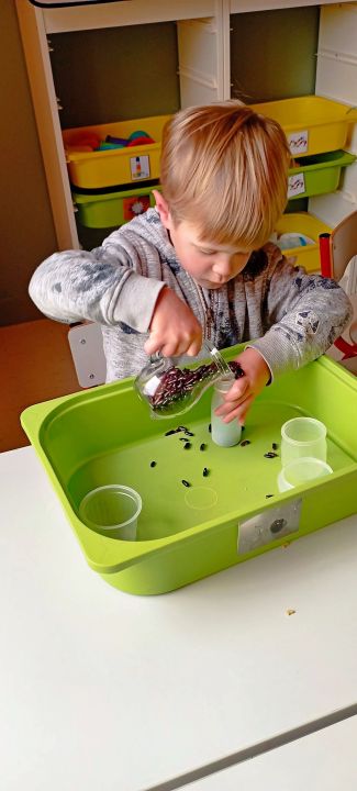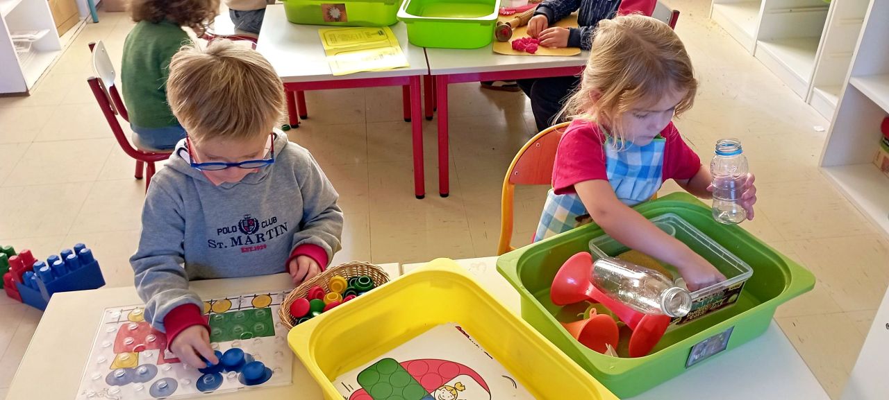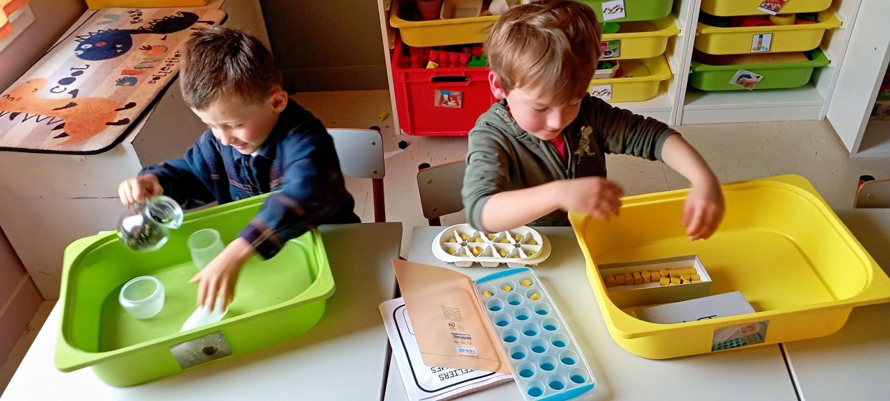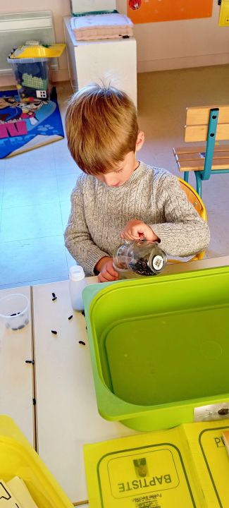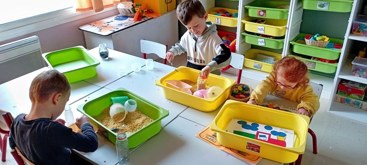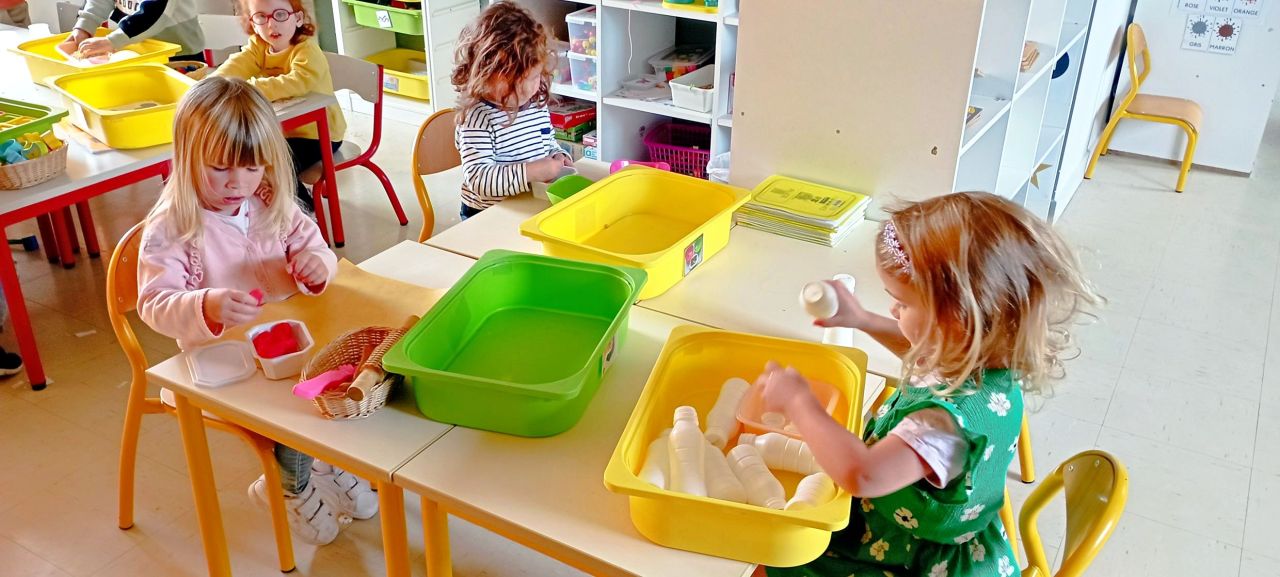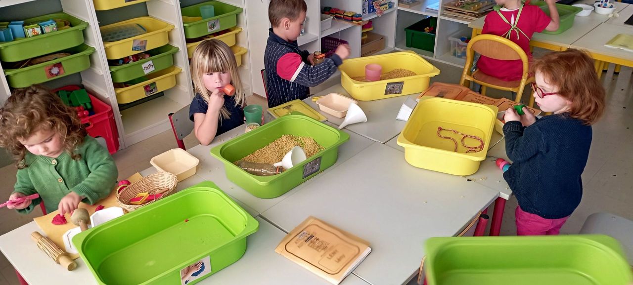 Depuis une dizaine de jours, les élèves découvrent les bacs d'ateliers autonomes : transvasements, tri, pâte à modeler, construction, pinces à linge, collier de perles...