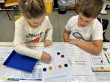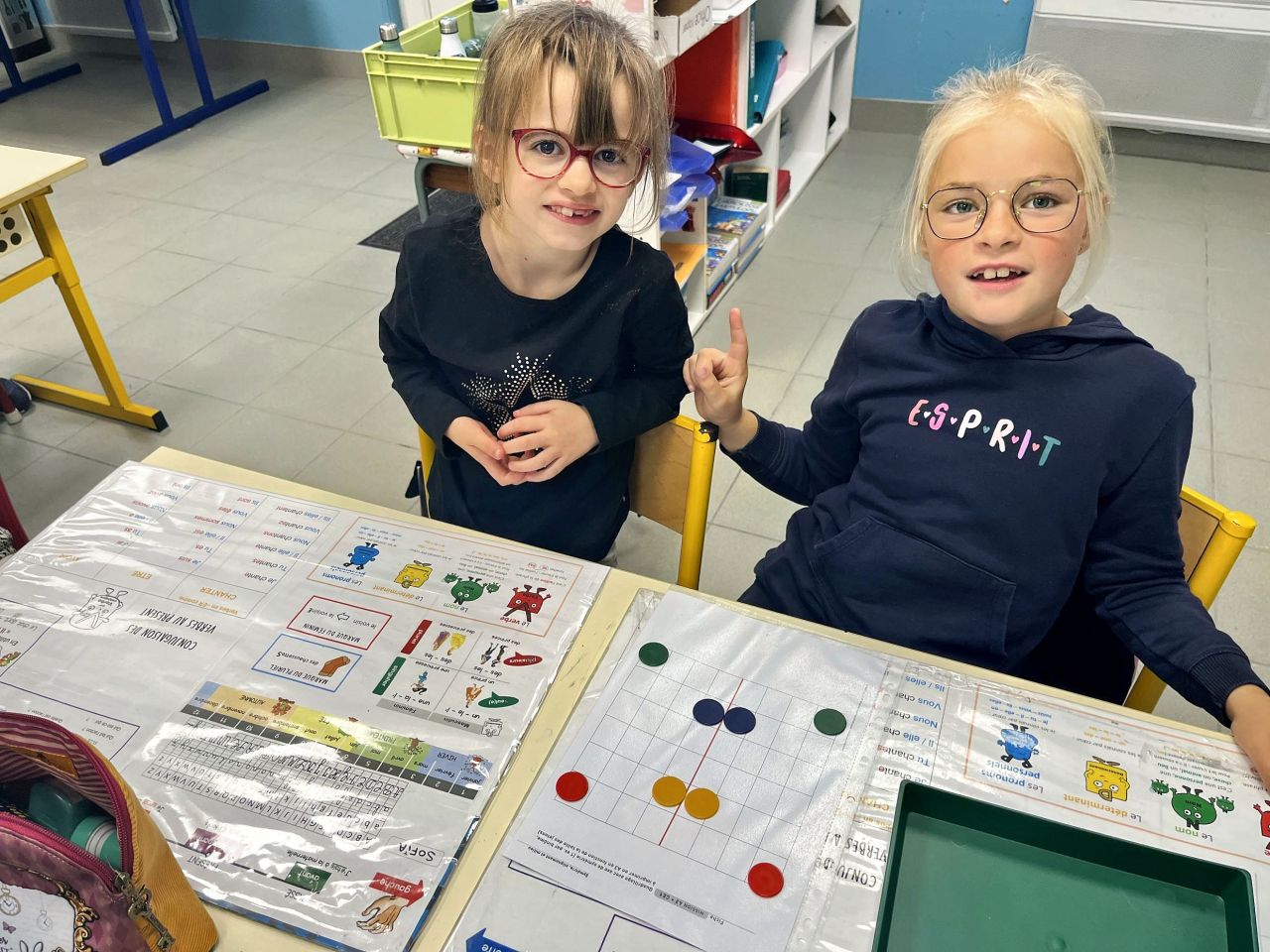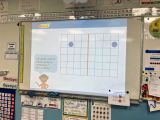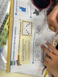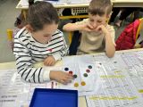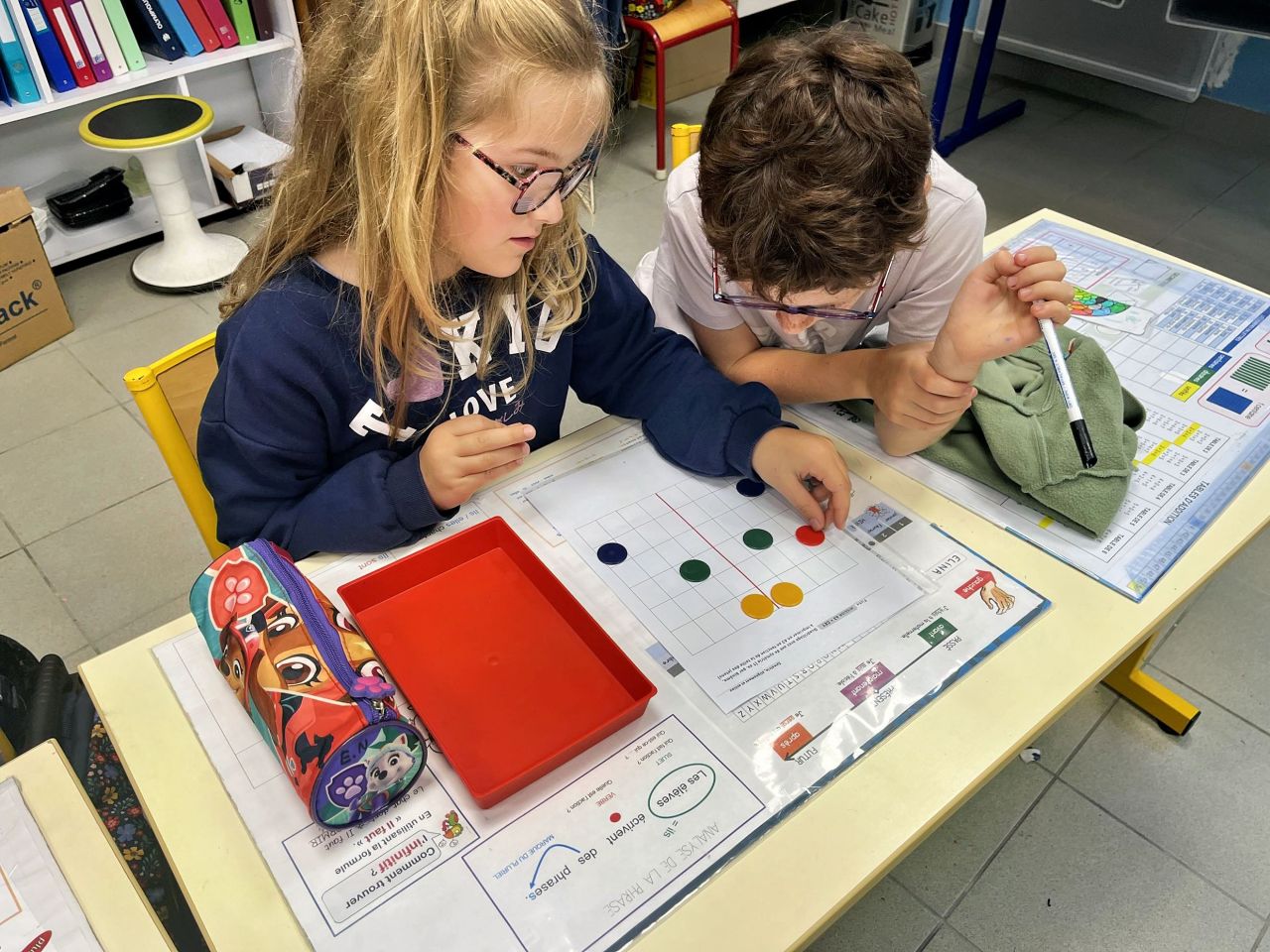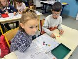 Manipulation en binôme (jeu du miroir avec des jetons de couleur) puis travail en collectif (l’image au tableau est elle symétrique ? Oui/non ? Pourquoi?) et pour finir exercices sur le fichier