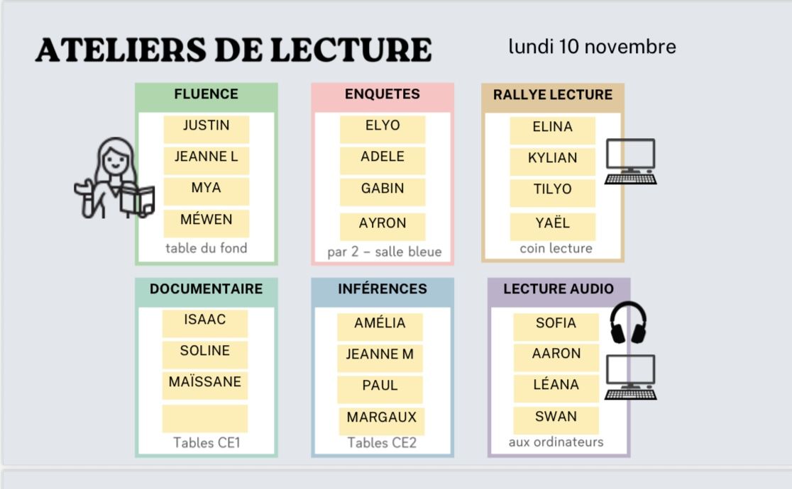 Dans notre classe, la lecture va prendre vie sous toutes ses formes grâce à une organisation d’ateliers variés. Deux fois par semaine, les élèves vont participer à des séances de lecture en petits groupes, où chacun explore un atelier / un univers différent. Les ateliers fonctionnent en rotation : à chaque séance, les groupes changent d’activité, afin que tous les élèves puissent découvrir l’ensemble des six ateliers au fil des semaines.